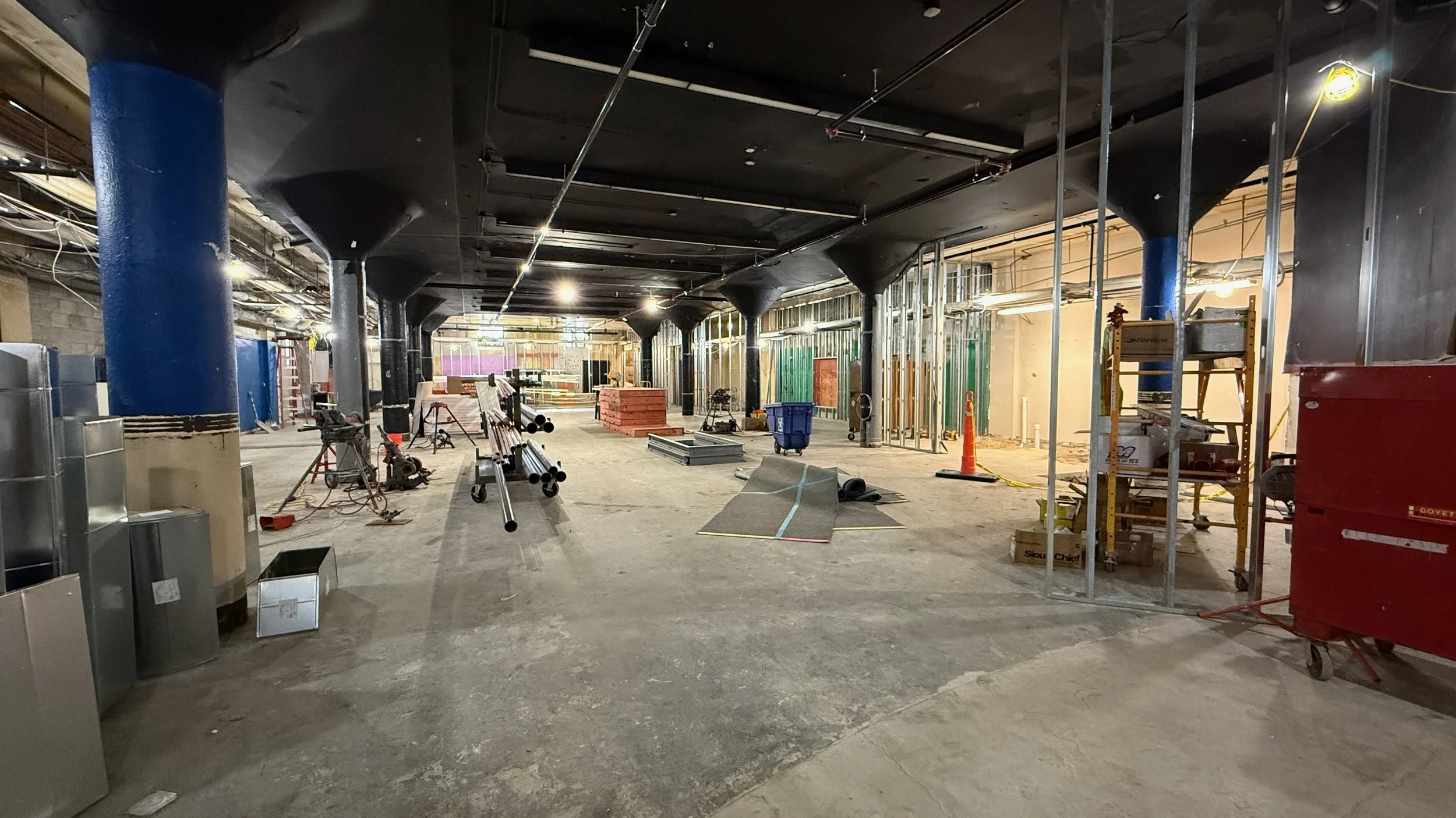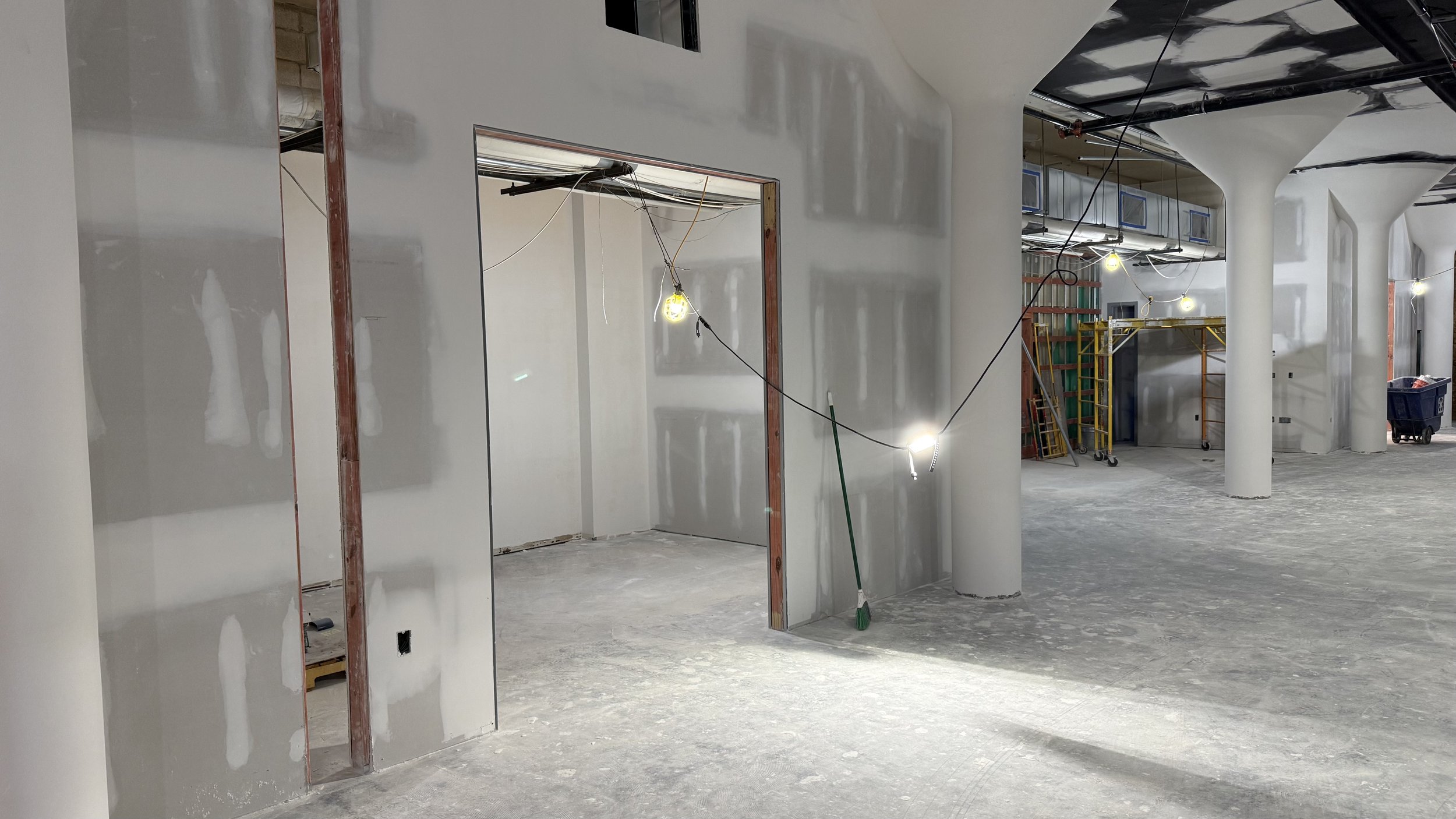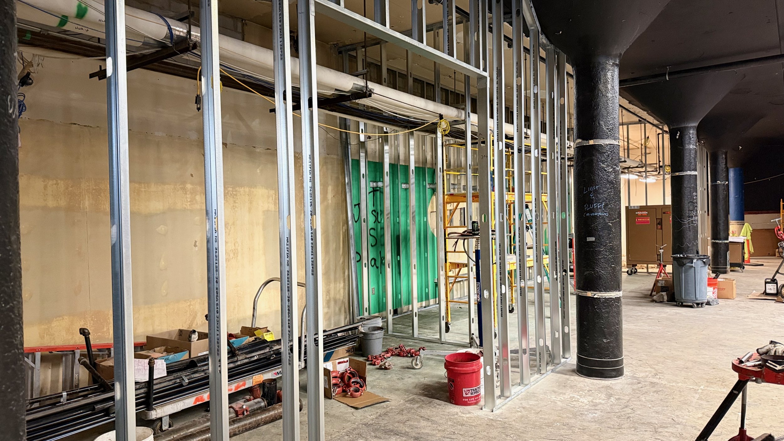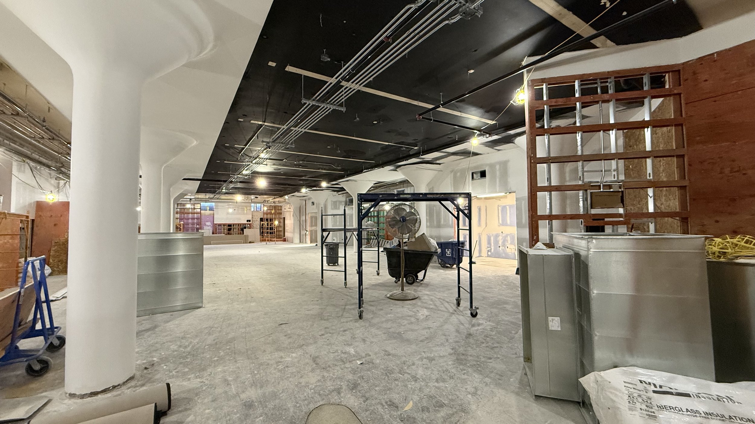 Over the next two weeks, we are hopeful to finish all of the drywall in the entire space, and to start getting finish carpentry underway, casework (cabinets, etc) installed, countertops measured and installed, and the “Tetris” seating (a very cool seating area) framed in.